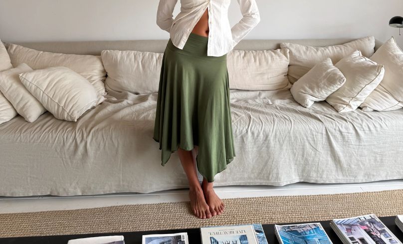 Salma Malhas, Jordanian actress and multidisciplinary artist, usually faces the lens, but she’s equally at home behind the scene, moving from Netflix sets to the Amman Film Festival and the African Film Festival in New York. Her vibe is cool-girl comfy with a playful, retro twist – think a bias-cut slip grounded by lived-in sneakers, or cargo trousers with a soft, body-skimming tank that hugs like a jersey. There’s a sporty-femme energy ease to it all: she dresses for the momentum, hands free, hair loose, and her favourite Johnny Farah bulk bag swallowing all her essentials. On Salma, cozy reads chic where the off-duty becomes the point.