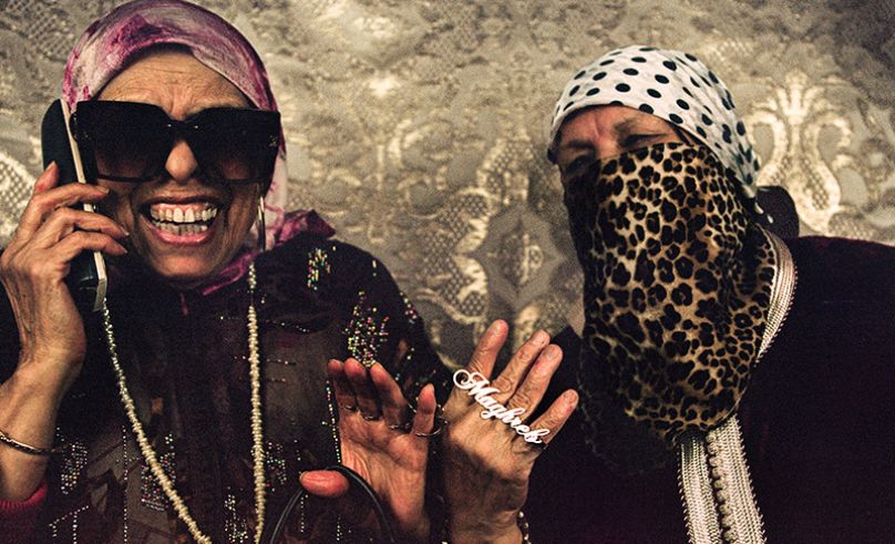 In Louhaichy’s childhood apartment, walls have been disassembled. For DIMA MAGHREB, they become stage sets where upholstery is pinned up like a curtain, self-tape lights glow and costumes come out. And then at the center of it all, her Meema (grandmother) and aunties step into the frame, four-finger rings spelling out what every Moroccan knows by heart before they even learn how to speak. DIMA MAGHREB.