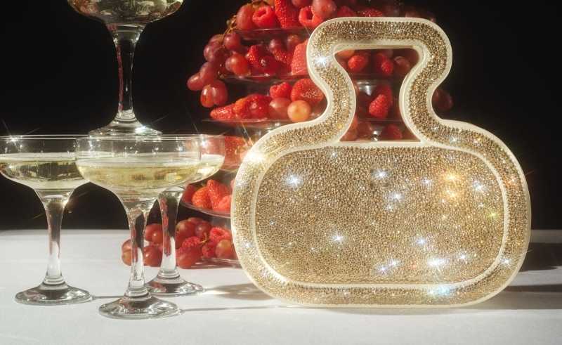 Ilyes Ouali’s Silhouette Bag is Buttercream on the verge of champagne. Encrusted with Swarovski crystals, it feels like the evening version of a writer’s satchel: small, structured, and catching light like marginalia in gold ink. Carried to dinner after a long day, it shifts the whole look from work mode to “seen”.