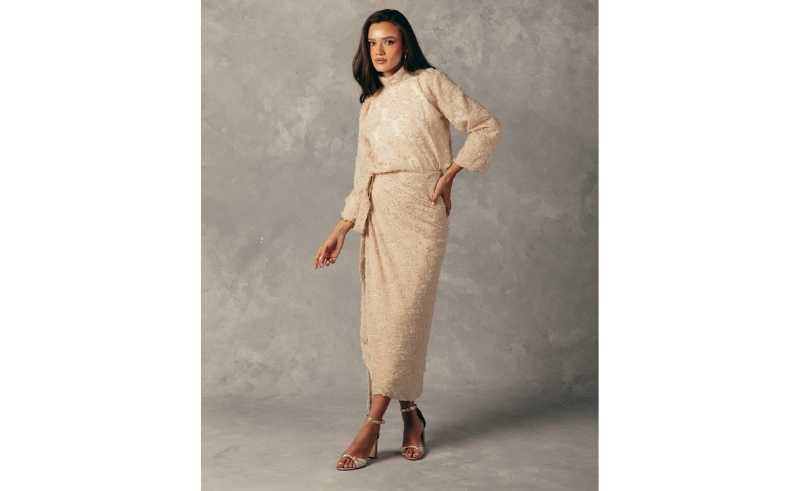 Noon by Noor’s Melhor Skirt takes Buttercream into movement. In a sand-leaning tone, it falls in long, clean lines that sway as you walk, giving every step a soft punctuation mark.