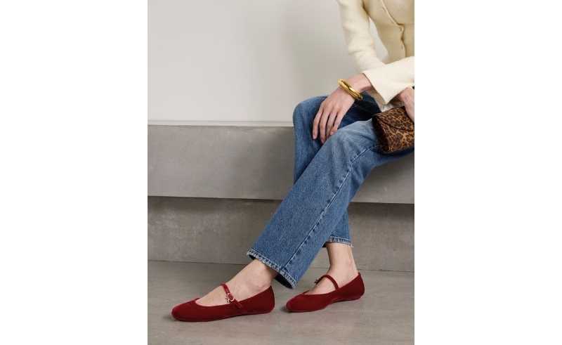 Gianvito Rossi finishes the story at ground level. The Carla velvet Mary Jane flats translate Racing Red into something plush and grounded, a shoe that can cross a city day without sacrificing romance. The Mary Jane strap and velvet finish give them a vintage inflection, while the saturated colour keeps them firmly in the present.