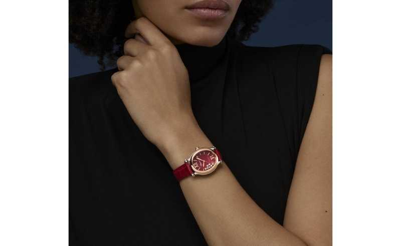 Chopard’s Happy Sport watch brings precision to the palette. The signature moving diamonds dance above a clean dial, while red accents on the strap and details tie the piece back into Racing Red. It is sporty and refined at once, the kind of watch that makes checking the time feel like part of your styling rather than a habit.