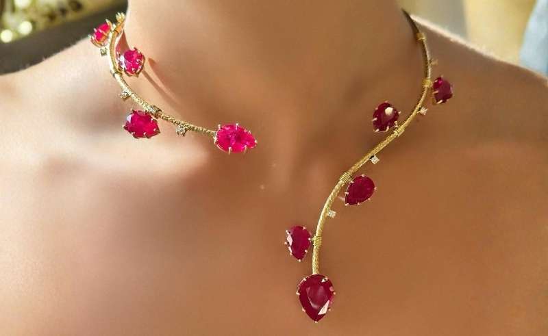 Onori the Label’s Victoria Dress anchors the tone in sculpted satin, its controlled volume giving Wild Strawberry a precise architectural edge. Dima Jewellery’s Hathor Necklace echoes the color’s depth through fluid gold lines and ruby notes drawn from the goddess of beauty and love. Maison Pacinthe Badran’s Rosalia Dress sharpens the shade into a cascade of satin and rose forms.