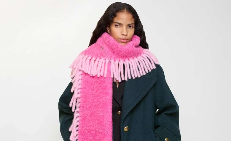 Accessories carry the color with the same discipline. Amina Muaddi’s Dalida PVC Platform Sandals give it glossy height; Namilia’s Deconstructed Handbag Jacket folds it into sculptural outerwear; and Burberry’s Alpaca Wool Blend Happy Scarf brings it into winter layering with clean, tactile warmth.