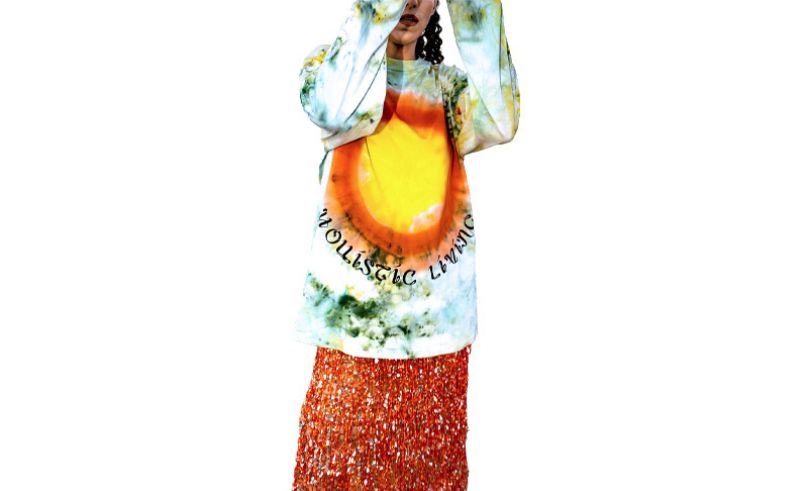 Tie-dye gone dark. The sprayed orb print feels mystical, while the hotfix sleeves scream “I’m not here for peace, I’m here for vibes.”