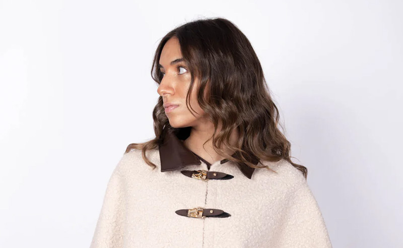 A softly structured shaggy wool-blend cape that drapes with quiet authority. The leather collar and buckle details sharpen the silhouette, making it the kind of outer layer that carries even the simplest office look.