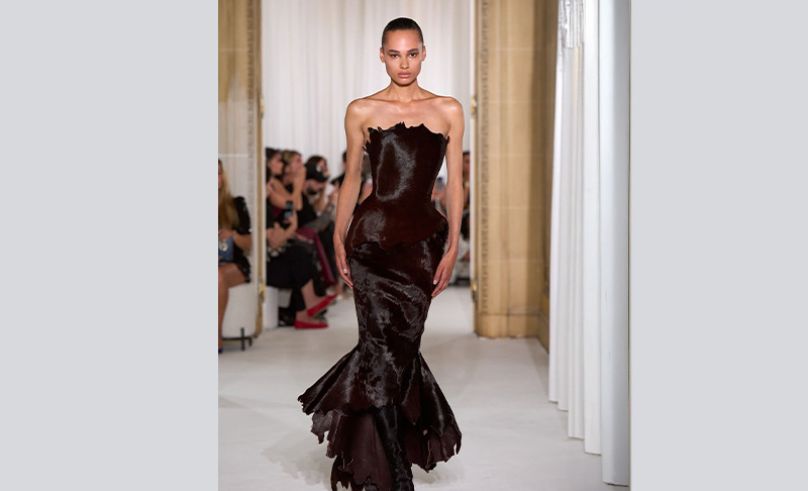 A corseted bodice and matching long skirt, crafted from rich cowhide, give this Ashi Studio look a grounded, unexpected edge. Structured, earthy, and commanding, it turns the carpet into a stage.