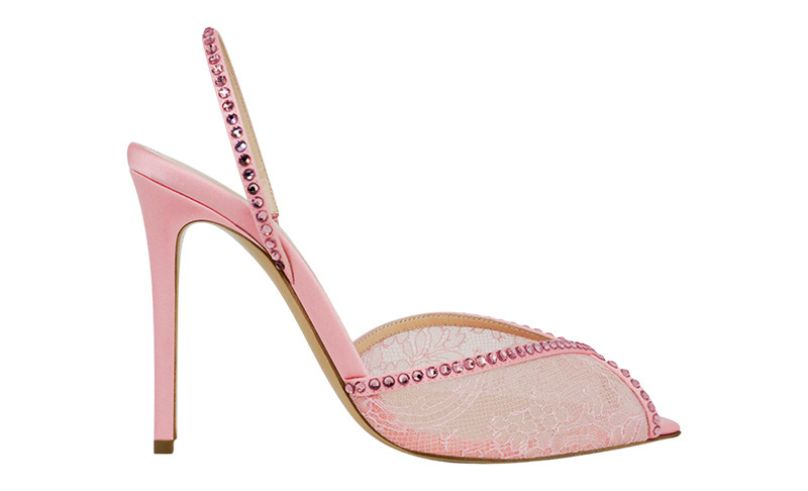 Delicate lace, mesh, and crystals come together in this slingback heel. Feminine yet sharp, it’s the shoe that takes gowns from pretty to powerful.