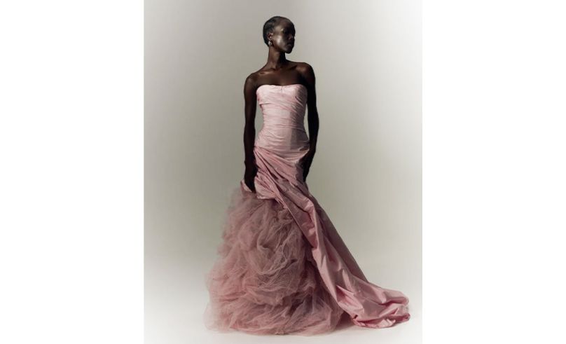 Sculpted mesh, scattered feathers, and a touch of whimsy — this Elias Riga piece is red carpet royalty. It’s ethereal yet commanding, ensuring whoever wears it owns the spotlight.